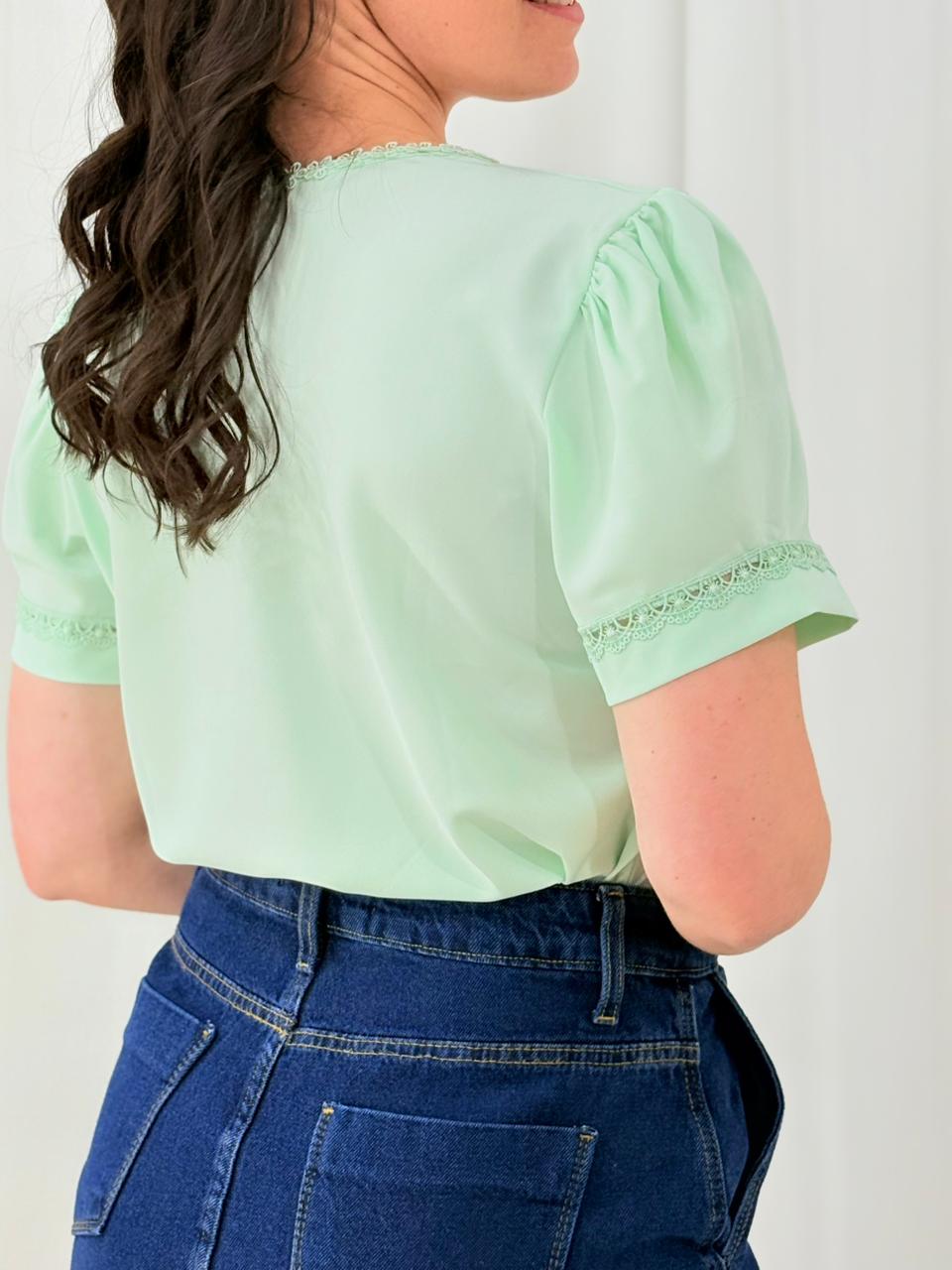 Blusa verde menta com detalhe rendado e recorte delicado no decote. Um toque de suavidade e elegância para qualquer ocasião!