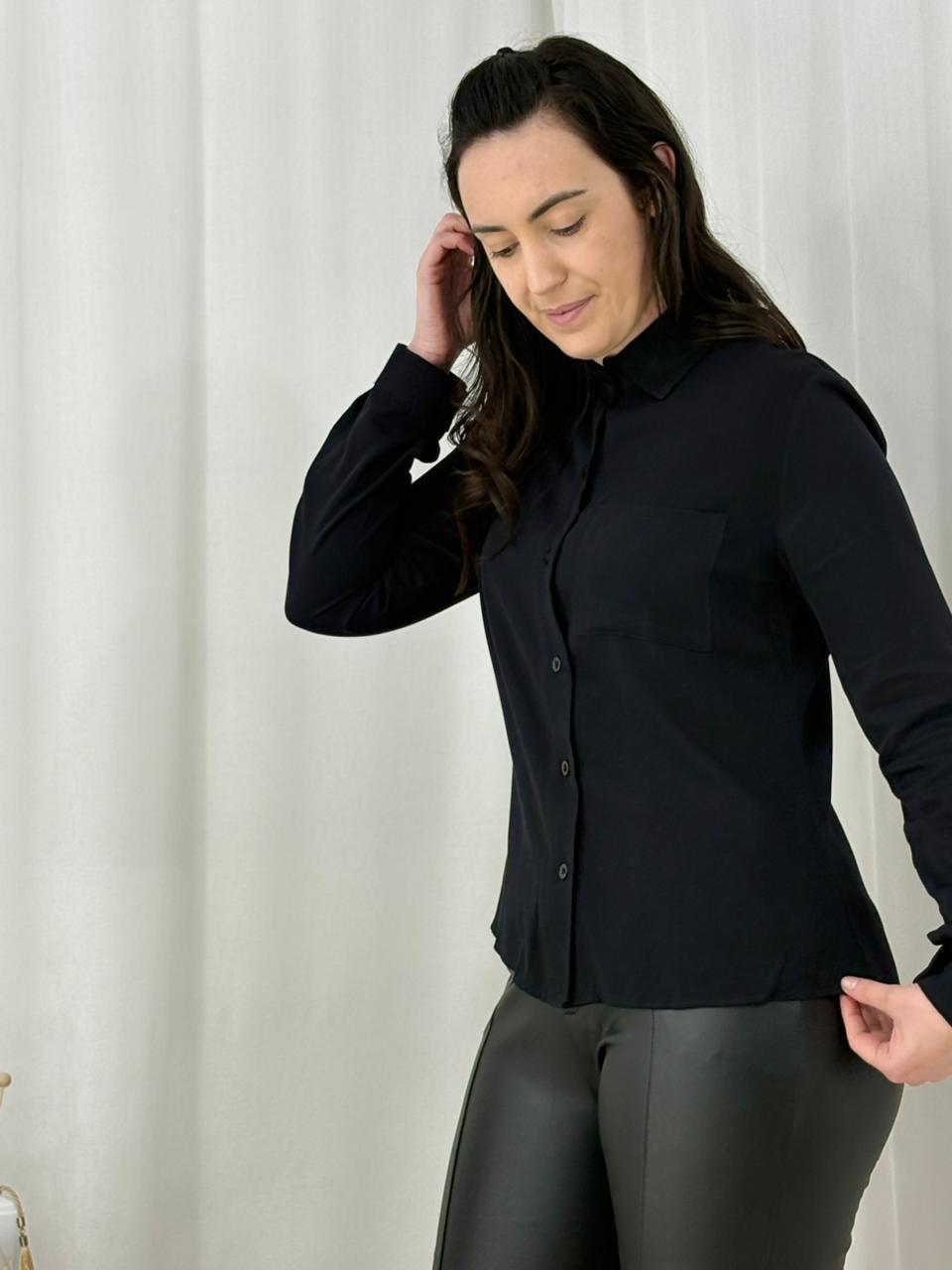 Camisa em viscosarja, manga longa com redução para 3/4, bolsinho no lado esquerdo e comprimento levemente alongado atrás. Disponível na cor preta, nos tamanhos P, M e G.