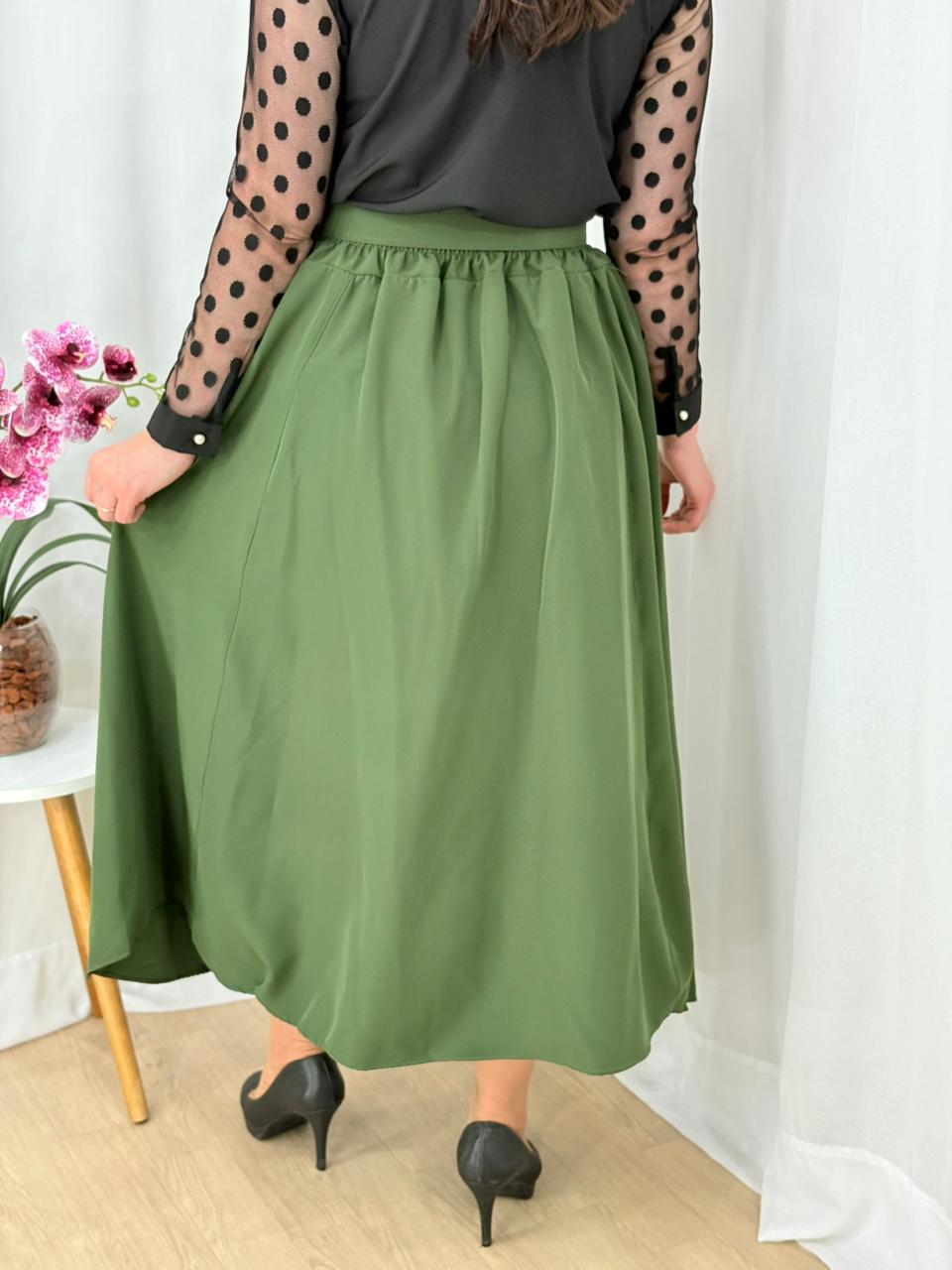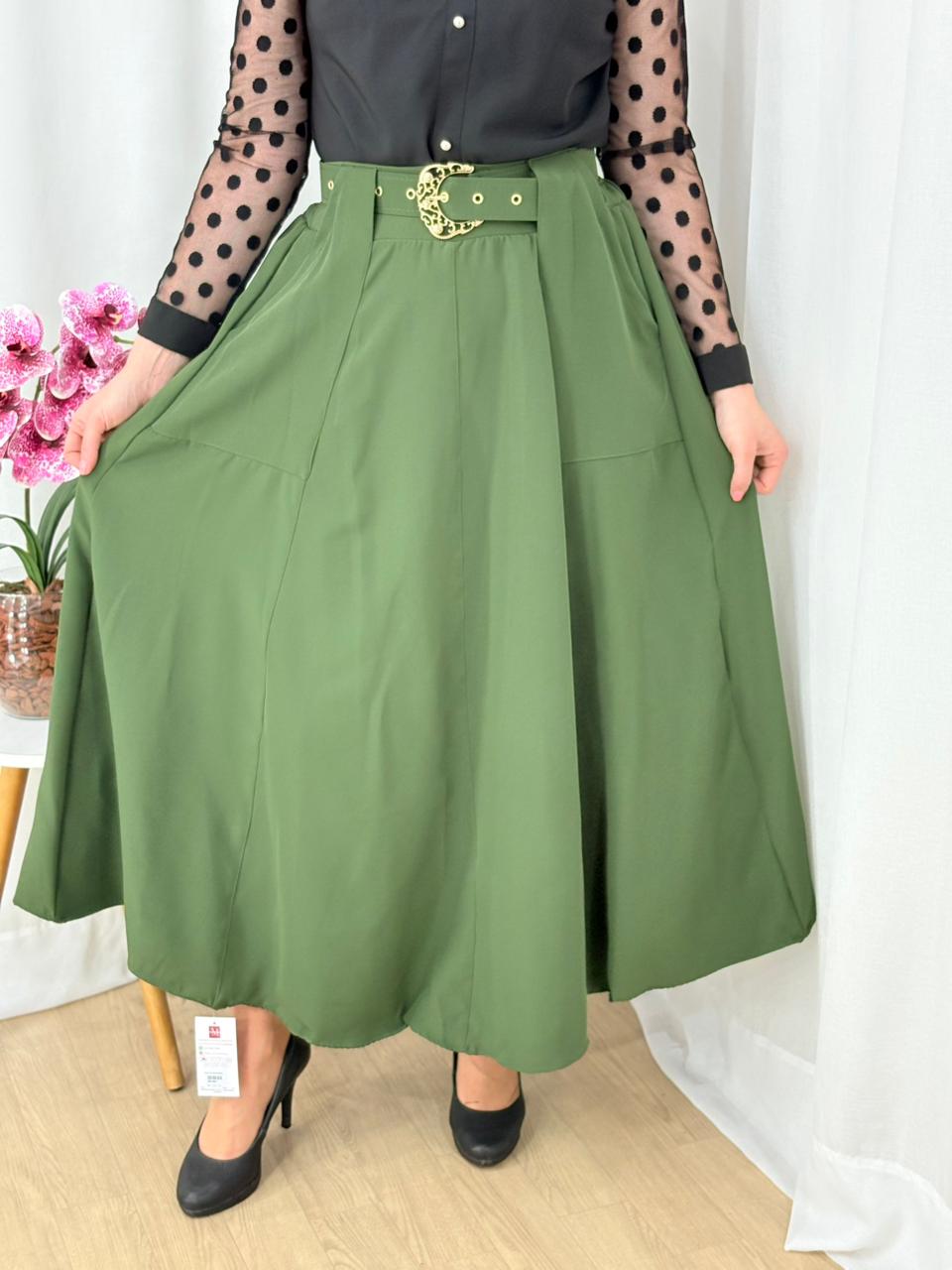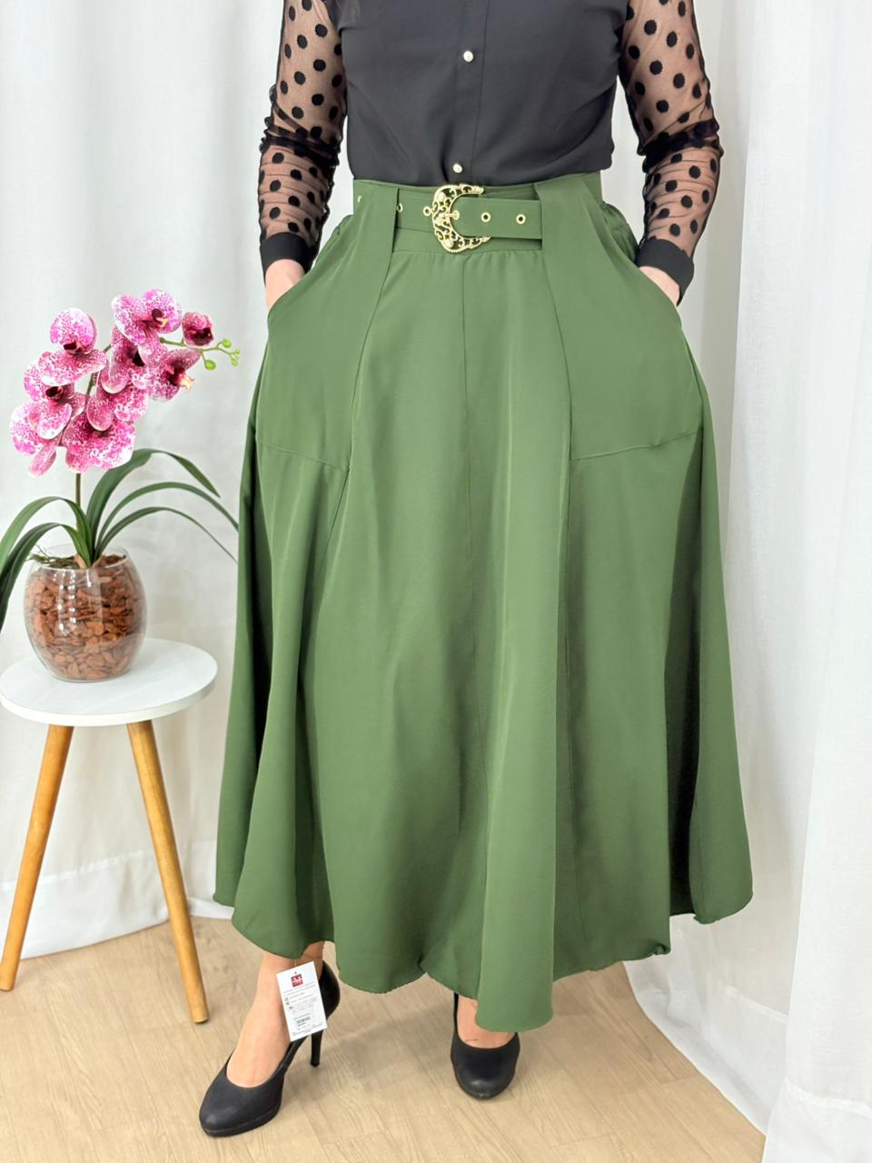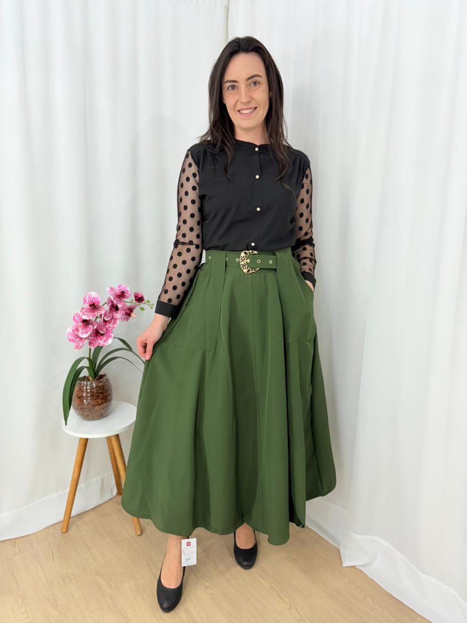 Saia de alfaiataria alongada, com modelagem elegante e moderna. Possui cinto com fivela dourada, bolsos frontais funcionais e elástico nas costas para um ajuste confortável. Disponível nos tamanhos P, M, G e GG.