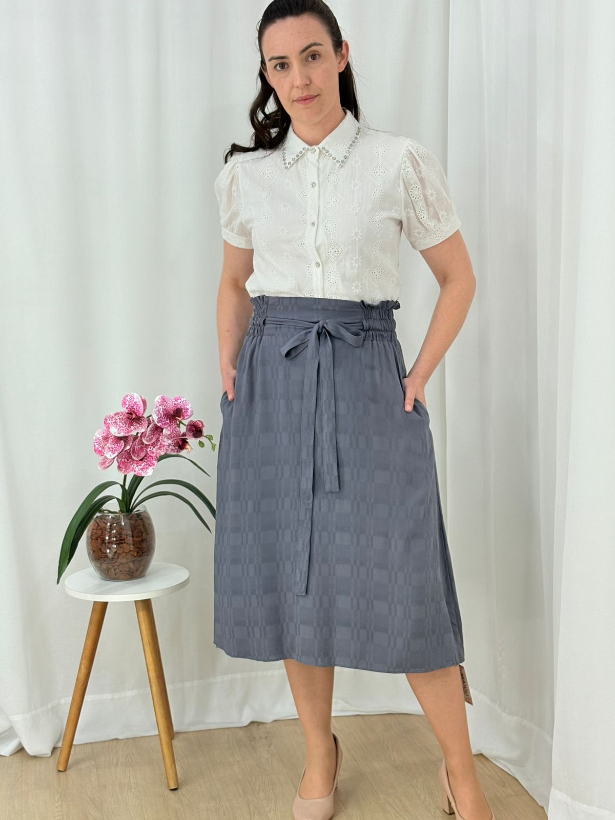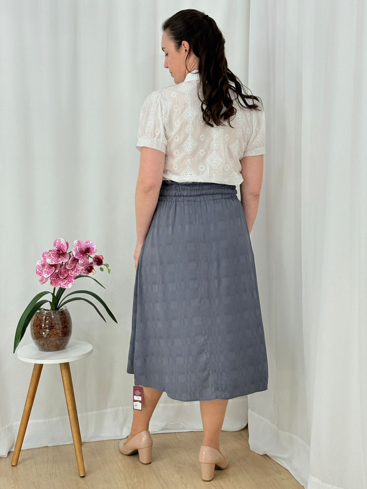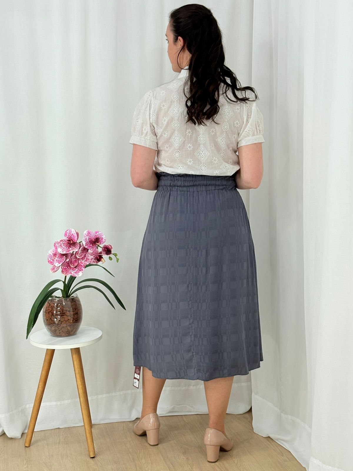 Saia midi com cós alto e amarração, confeccionada em tecido leve com textura discreta. Um modelo elegante e confortável para o dia a dia.