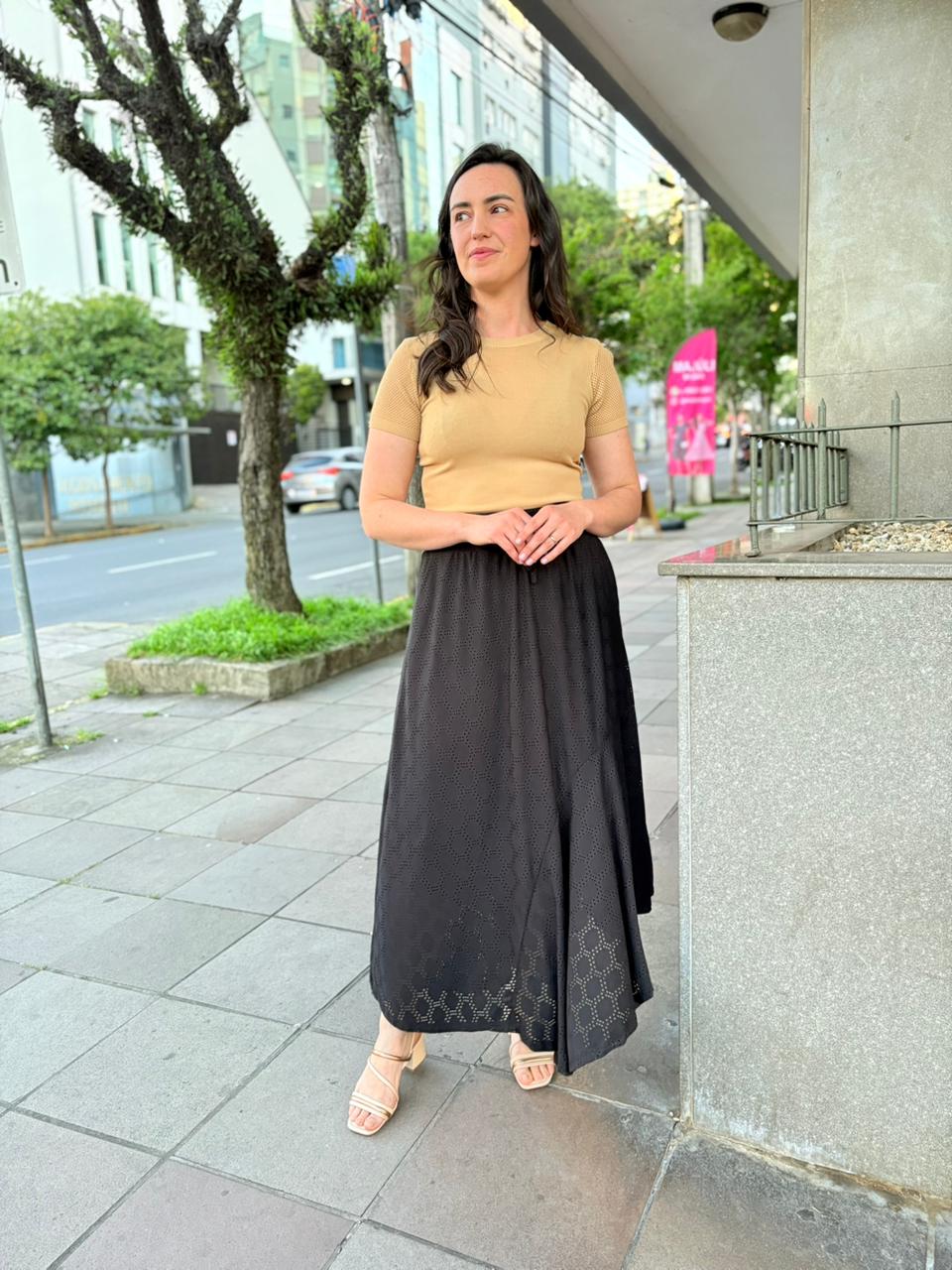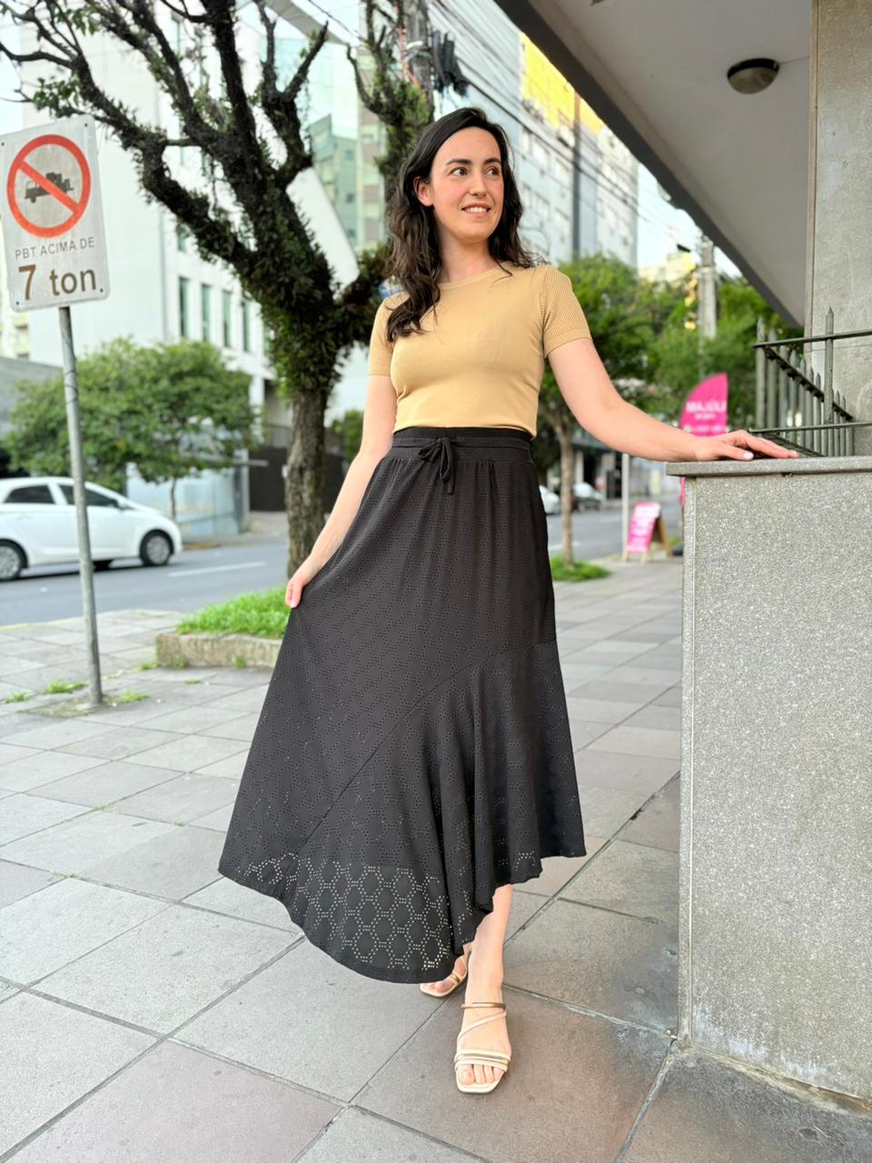 Saia midi em laise com recorte e amarração na cintura. Leve, fluida e super elegante, é a peça ideal para compor looks com charme e conforto no dia a dia ou em ocasiões especiais. Disponível nas cores preta e vinho.