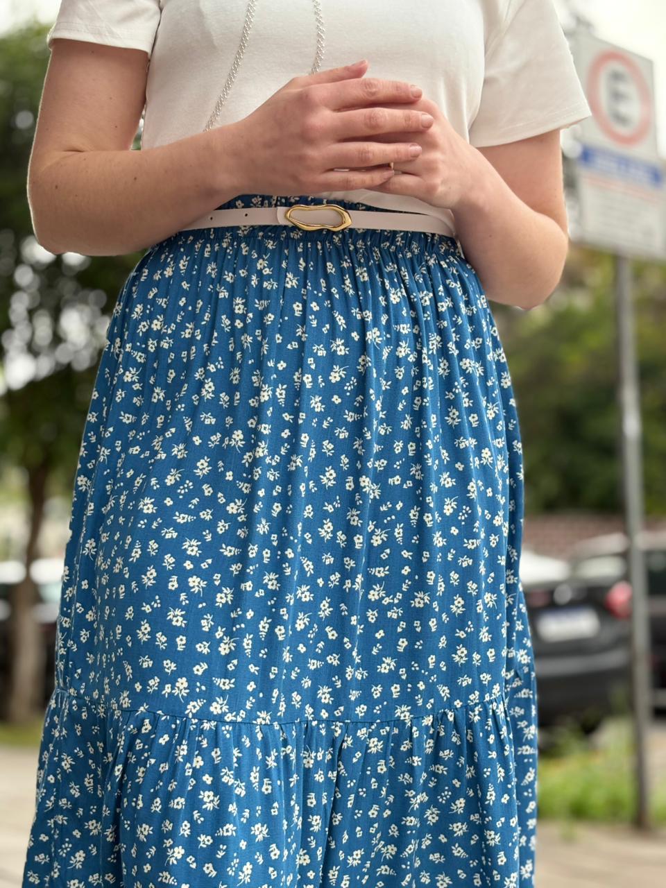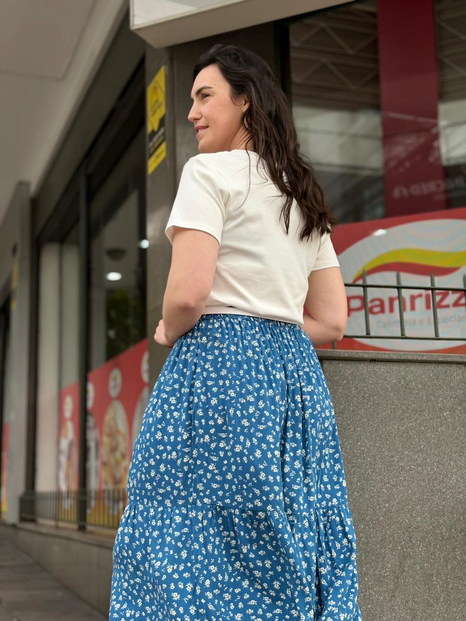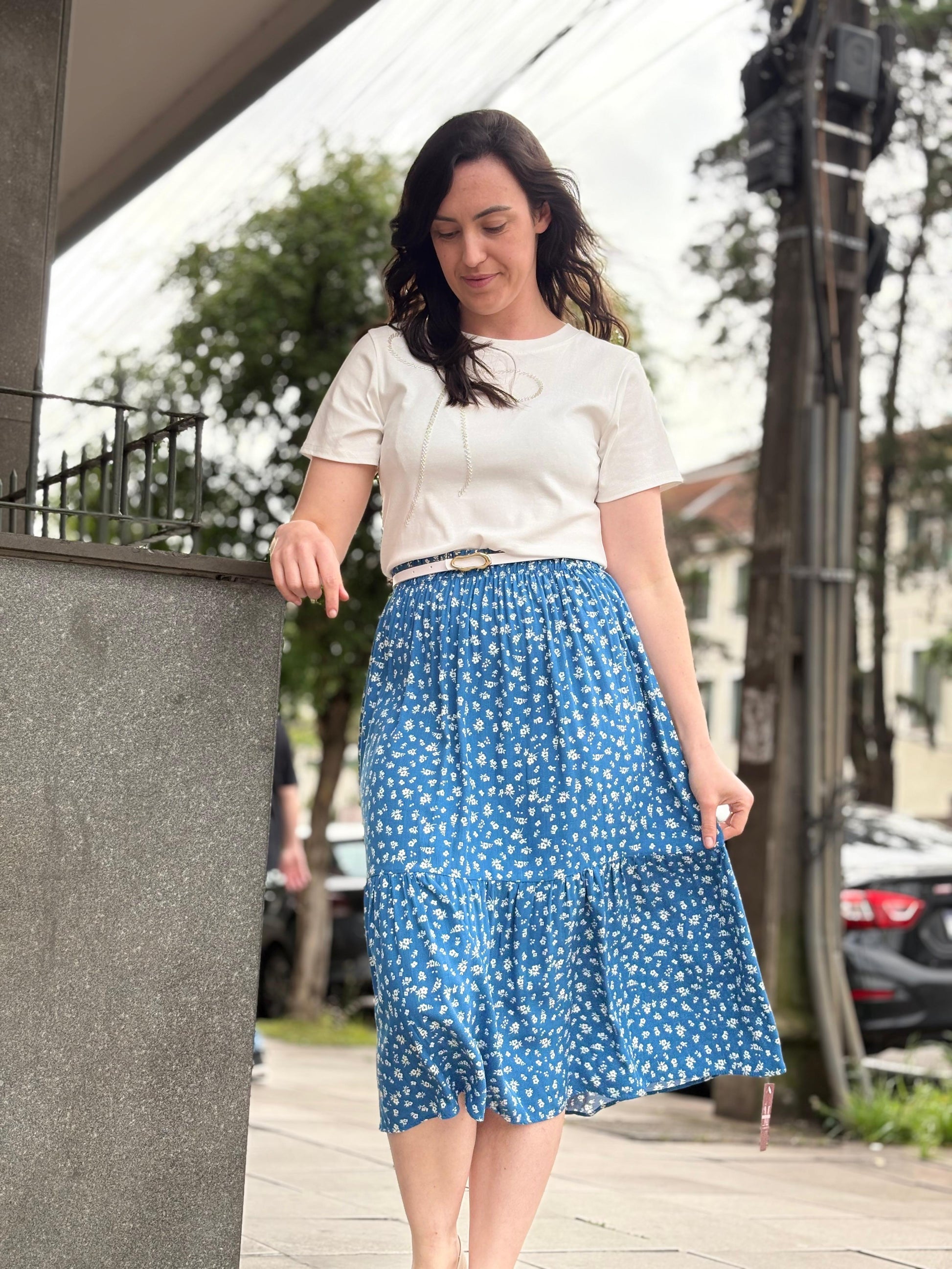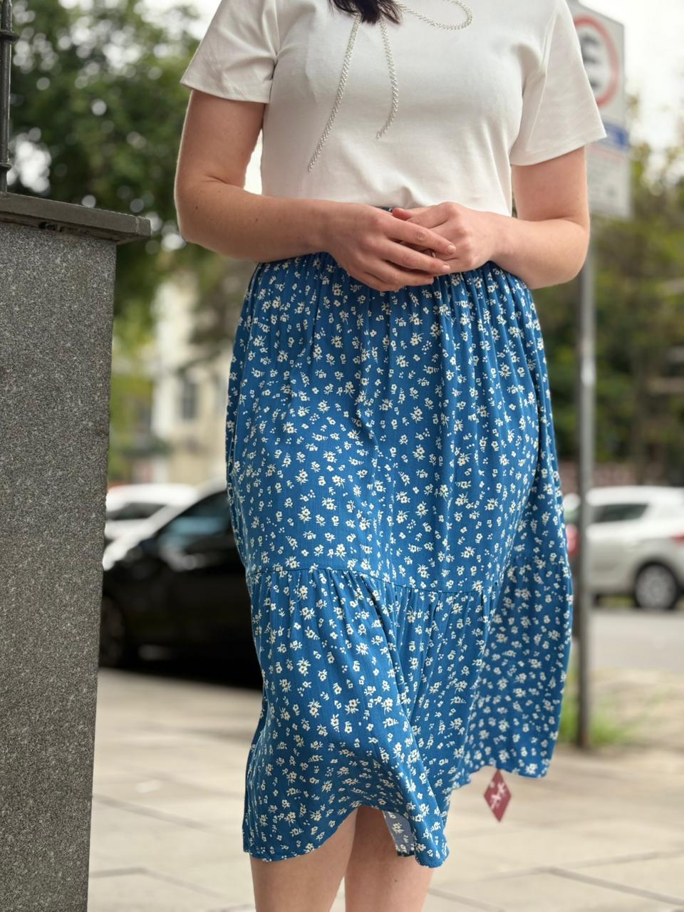 Saia midi com detalhe em maria, confeccionada em tecido leve e fluido. Disponível em 3 estampas encantadoras e tamanho único, veste com conforto e estilo para todas as ocasiões.