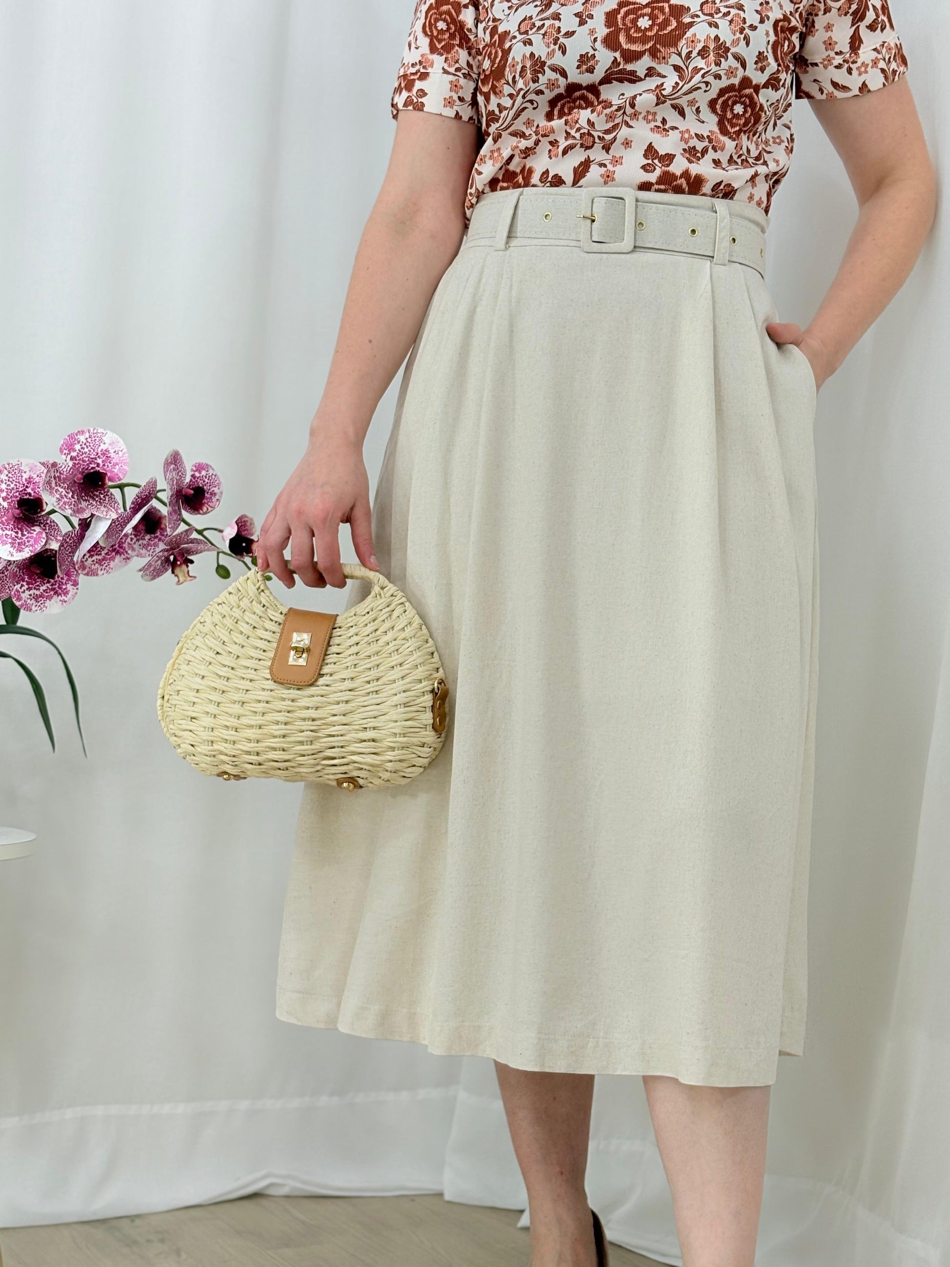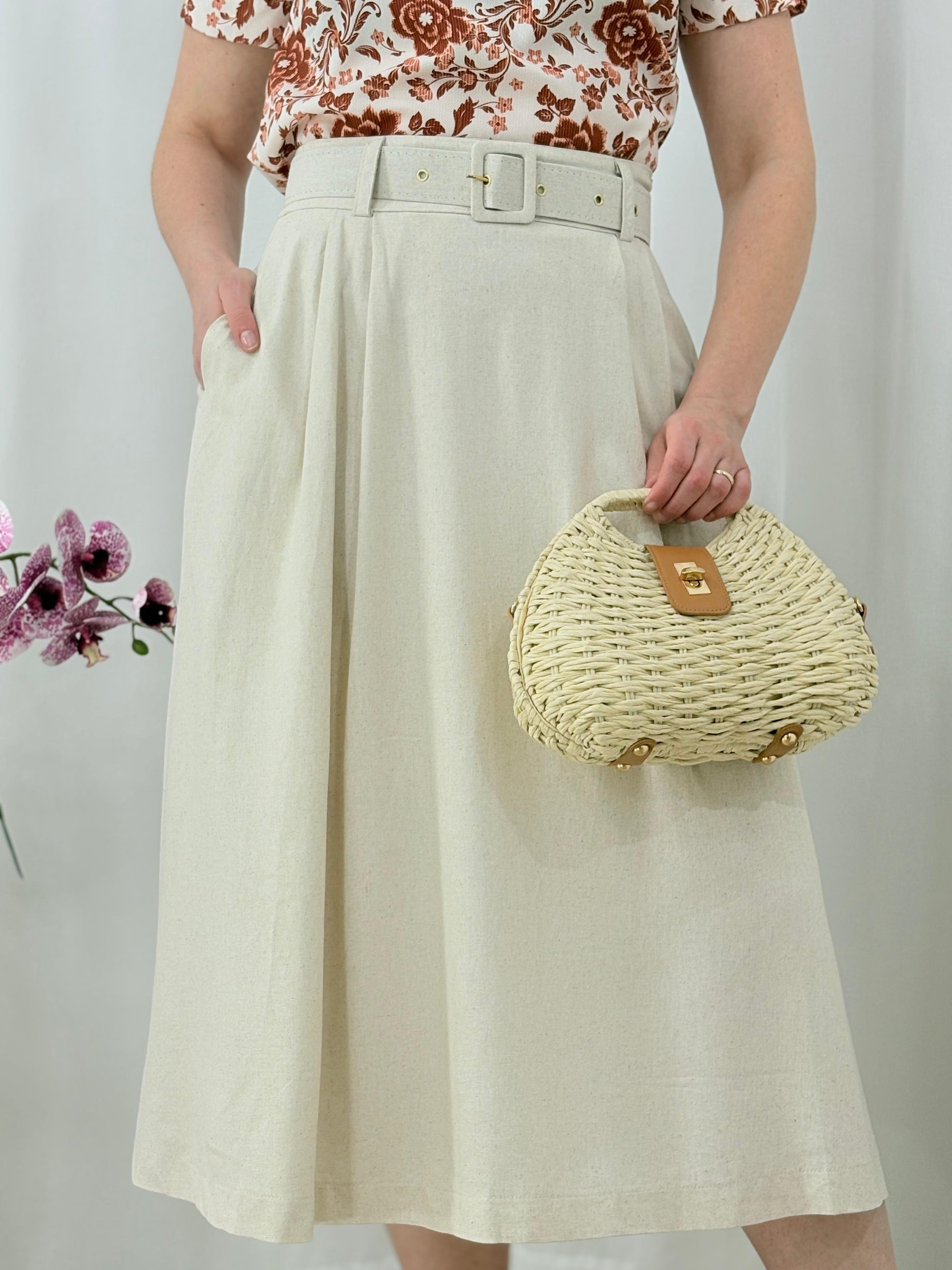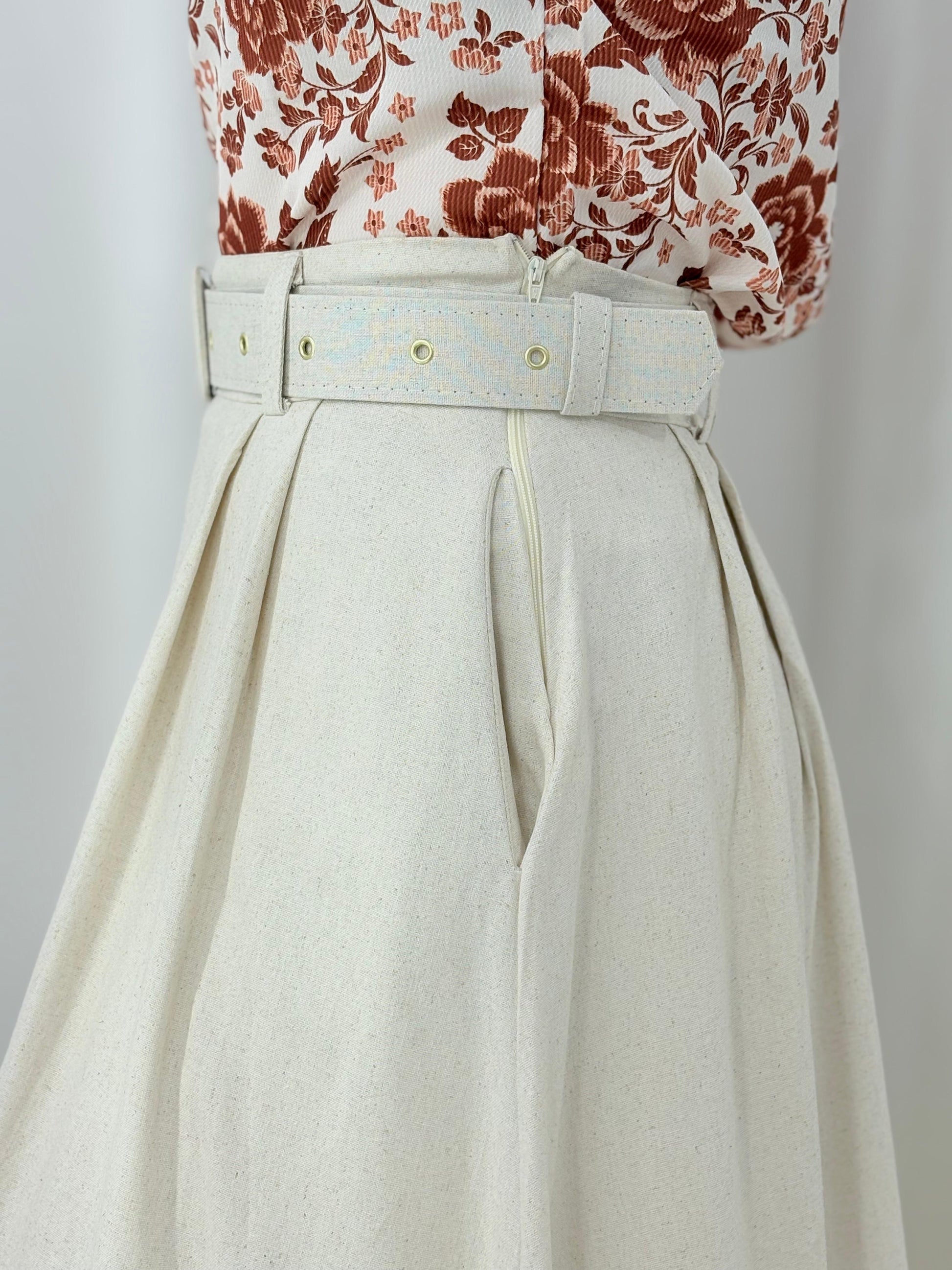 Saia godê em linho com cinto encapado do mesmo tecido e zíper lateral. Modelo clássico, elegante e com movimento leve — perfeita para compor looks sofisticados e confortáveis.