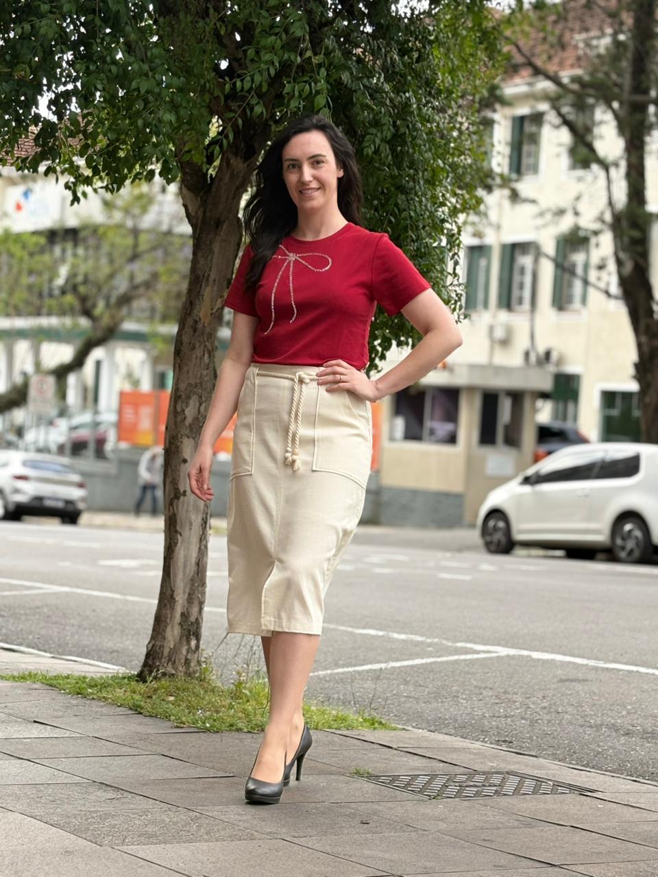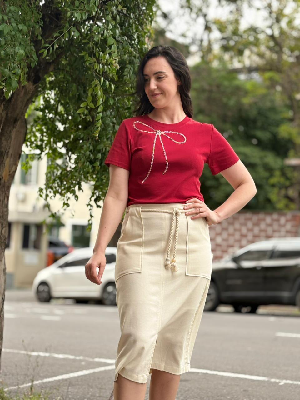 Saia midi em linho, com cordão ajustável na cintura e bolsos frontais funcionais. Elegância e conforto em uma única peça, perfeita para looks casuais e sociais.