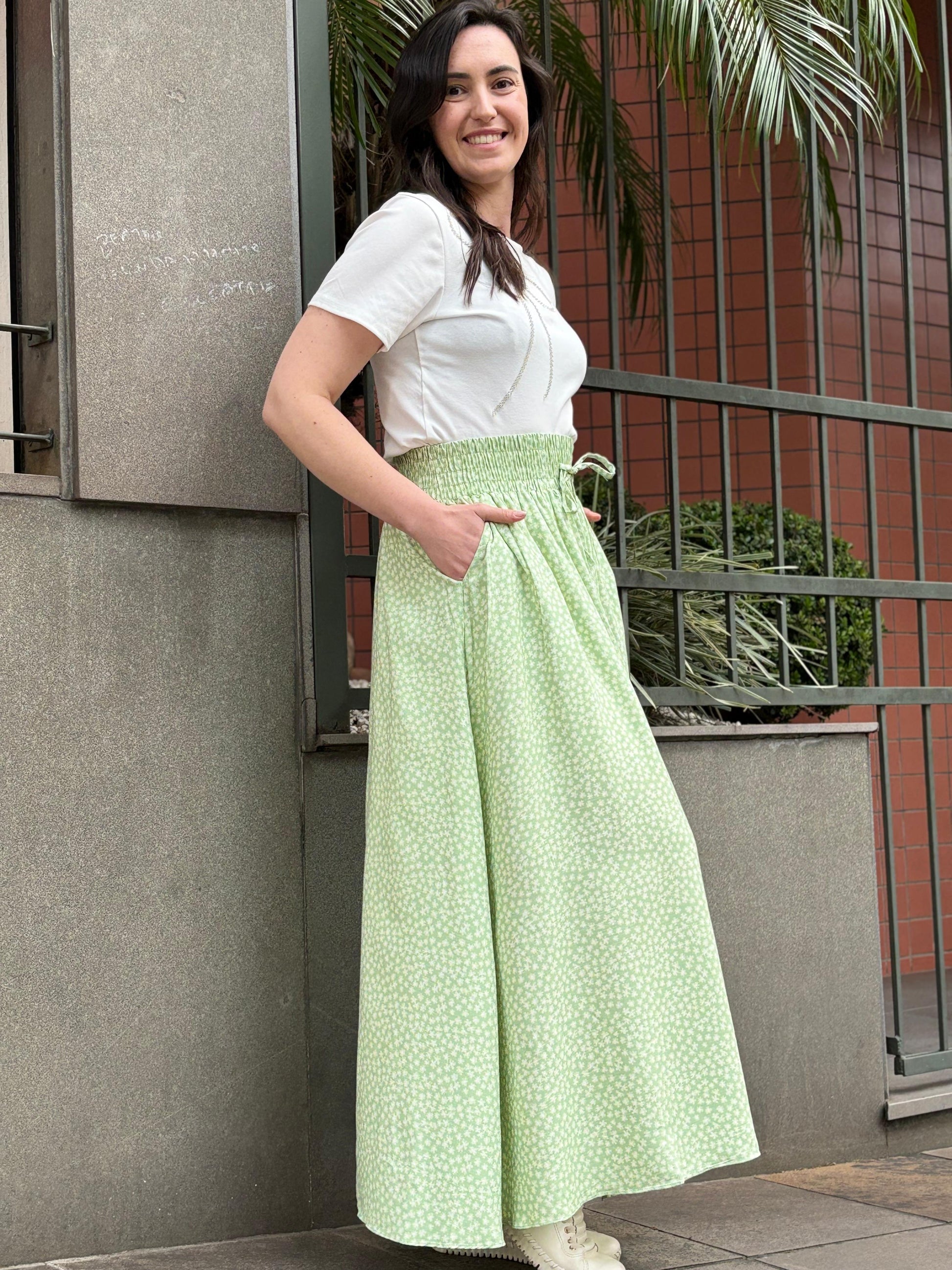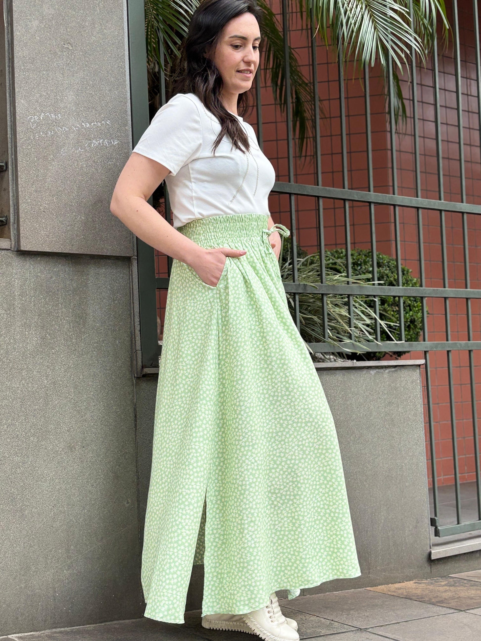 Saia longa em tecido leve e fluido, com cós alto e elástico, garantindo conforto e caimento perfeito. Disponível em estampas delicadas que trazem feminilidade e elegância ao visual.