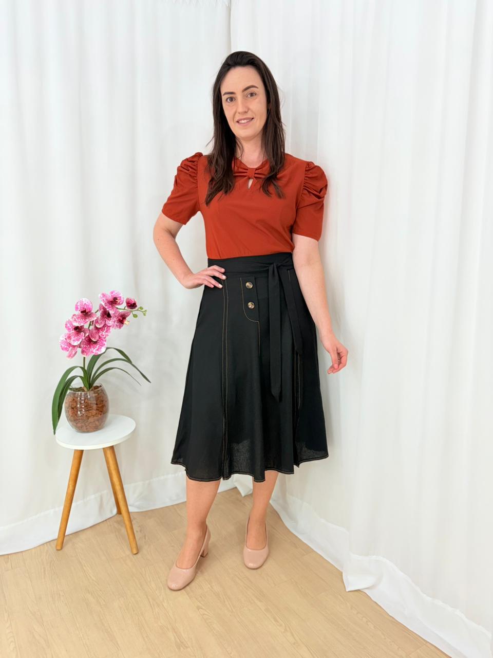 Saia em linho preta com modelagem evasê e detalhe em botões frontais. Possui faixa para amarração na cintura, realçando a silhueta com muito charme e elegância. Disponível nos tamanhos P ao GG.