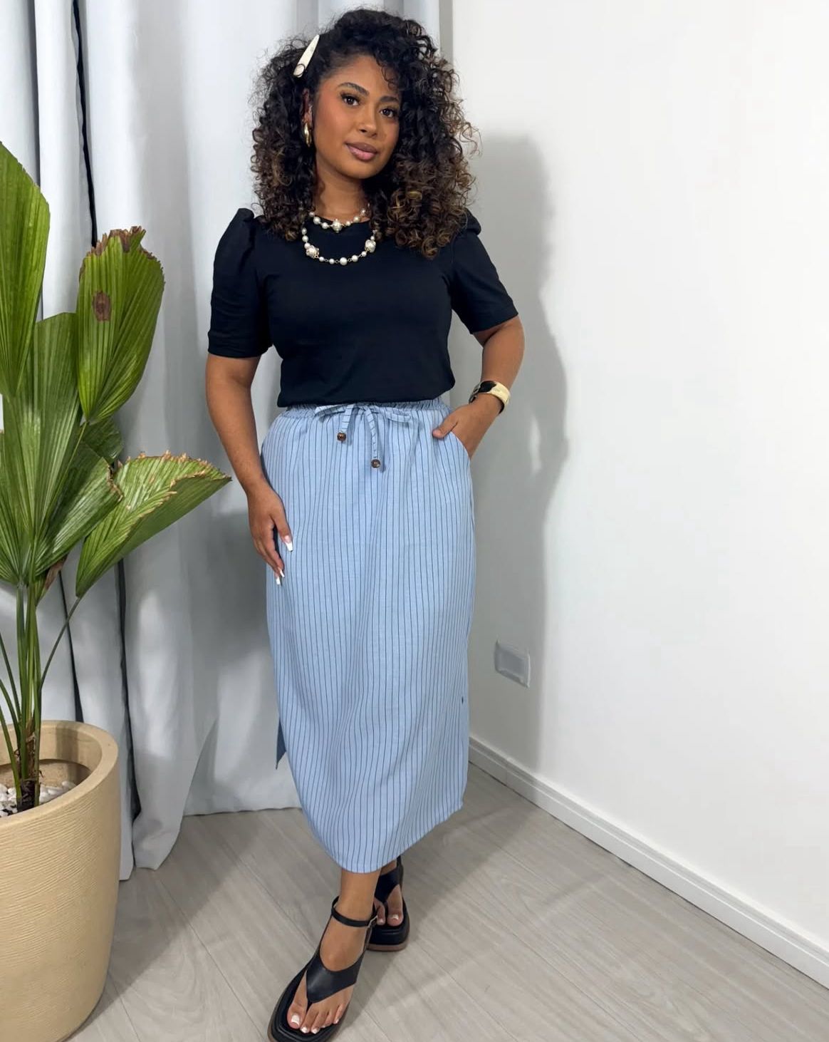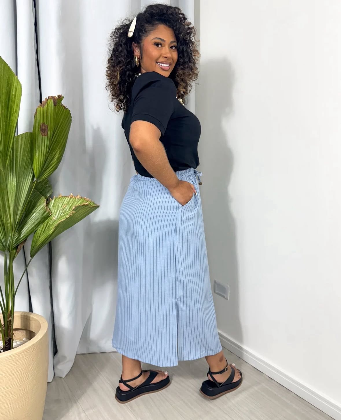 Saia midi em linho com listras finas, cós elástico e amarração frontal FAKE.