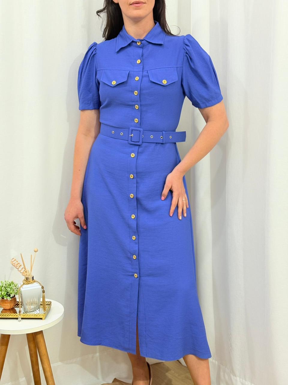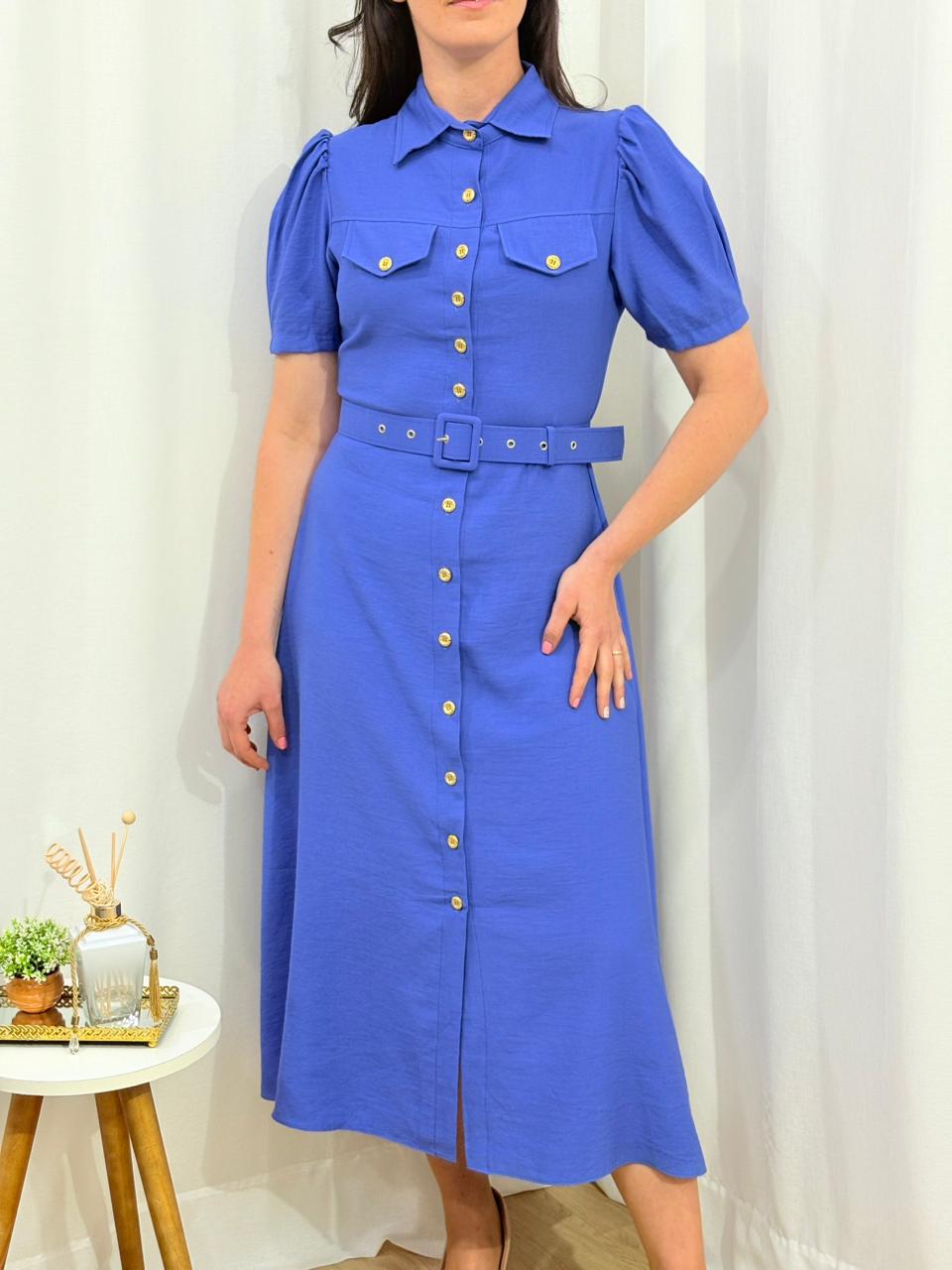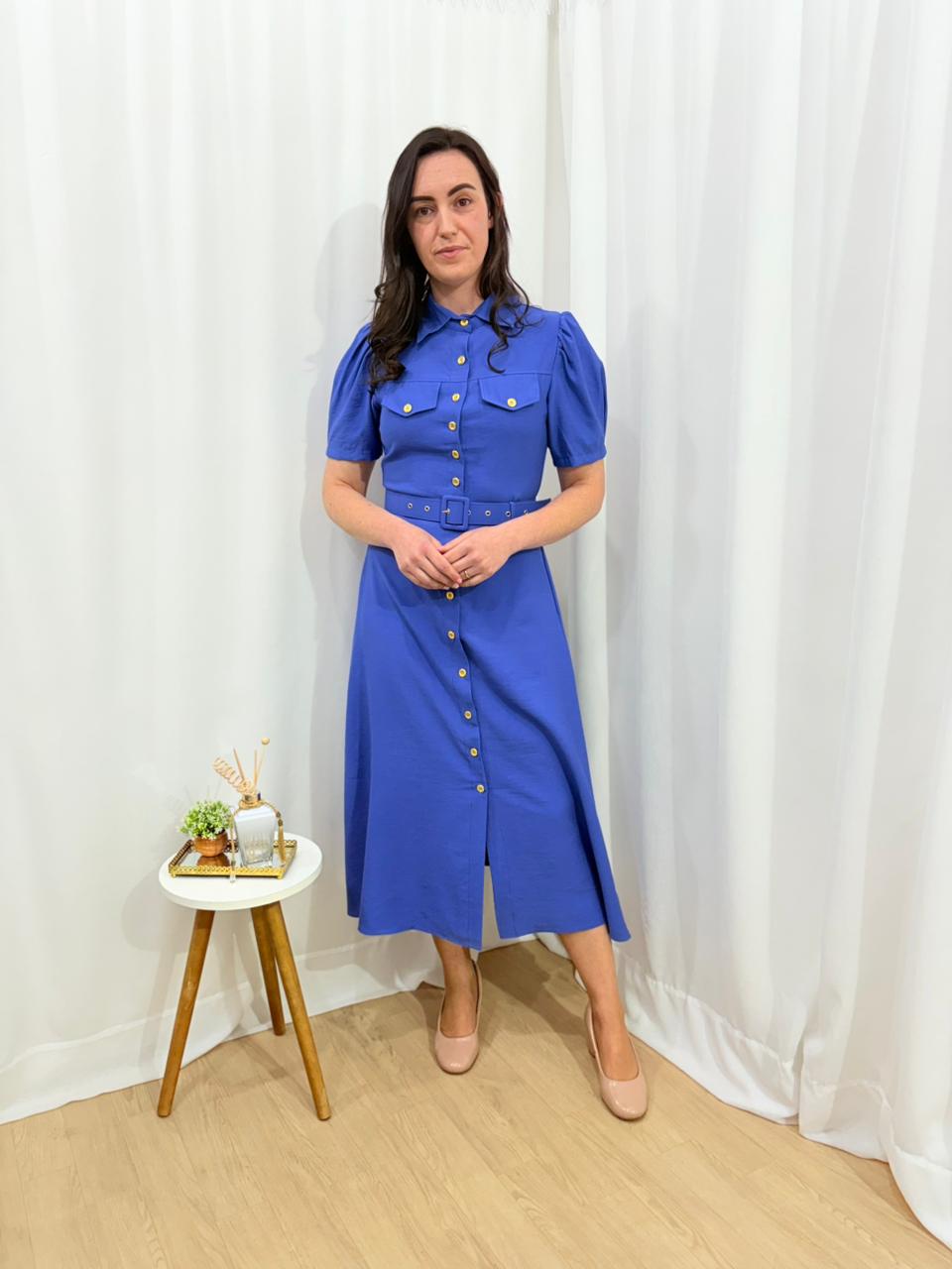 Chamise de alfaiataria marrom com botões dourados, cinto ajustável e comprimento midi. Elegante e versátil.