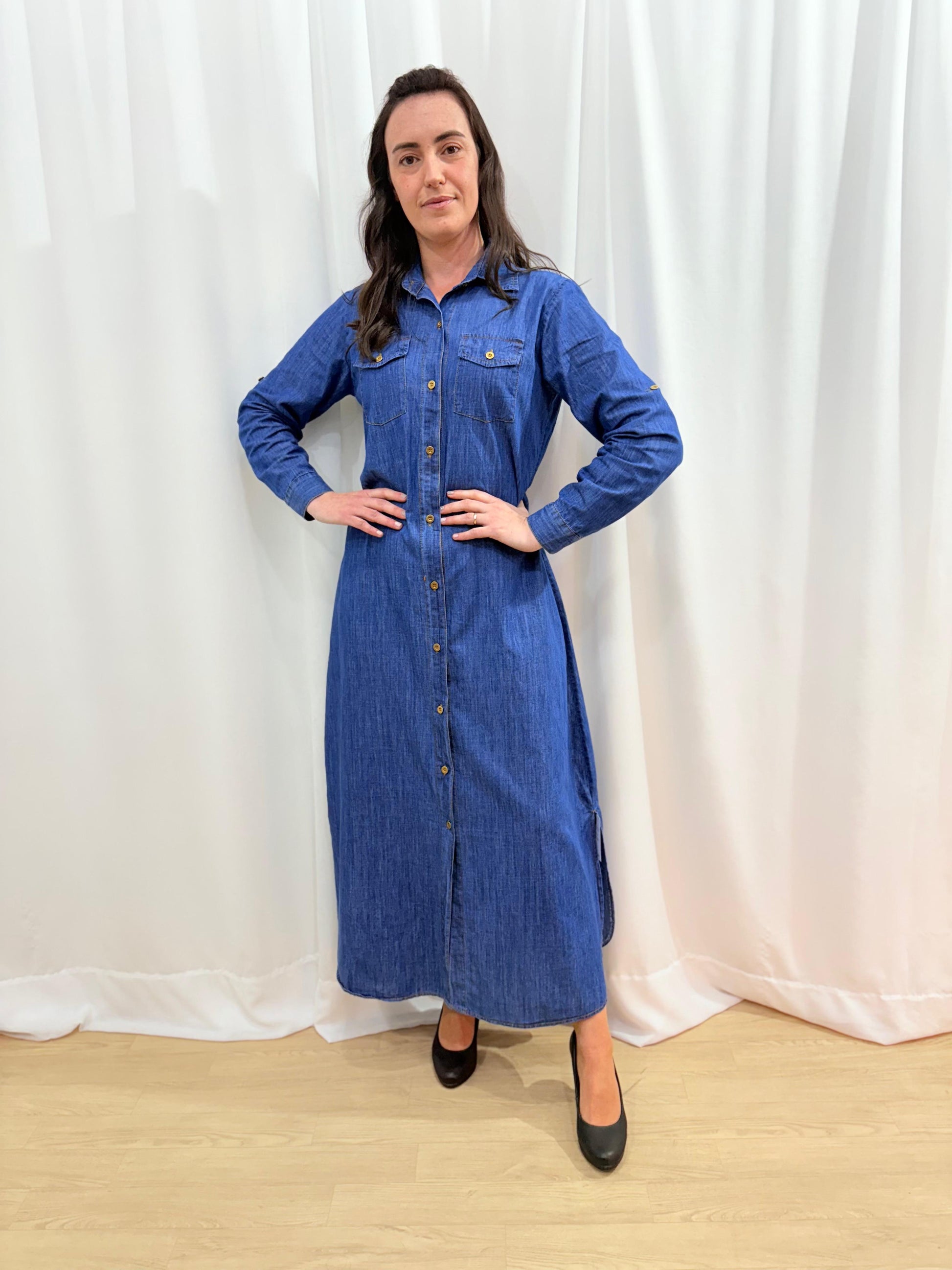 Vestido longo jeans – clássico e atemporal, confeccionado em jeans leve que garante conforto e praticidade no dia a dia. Com fechamento em botões frontais e bolsos funcionais, é a peça ideal para compor looks elegantes e versáteis em todas as ocasiões.