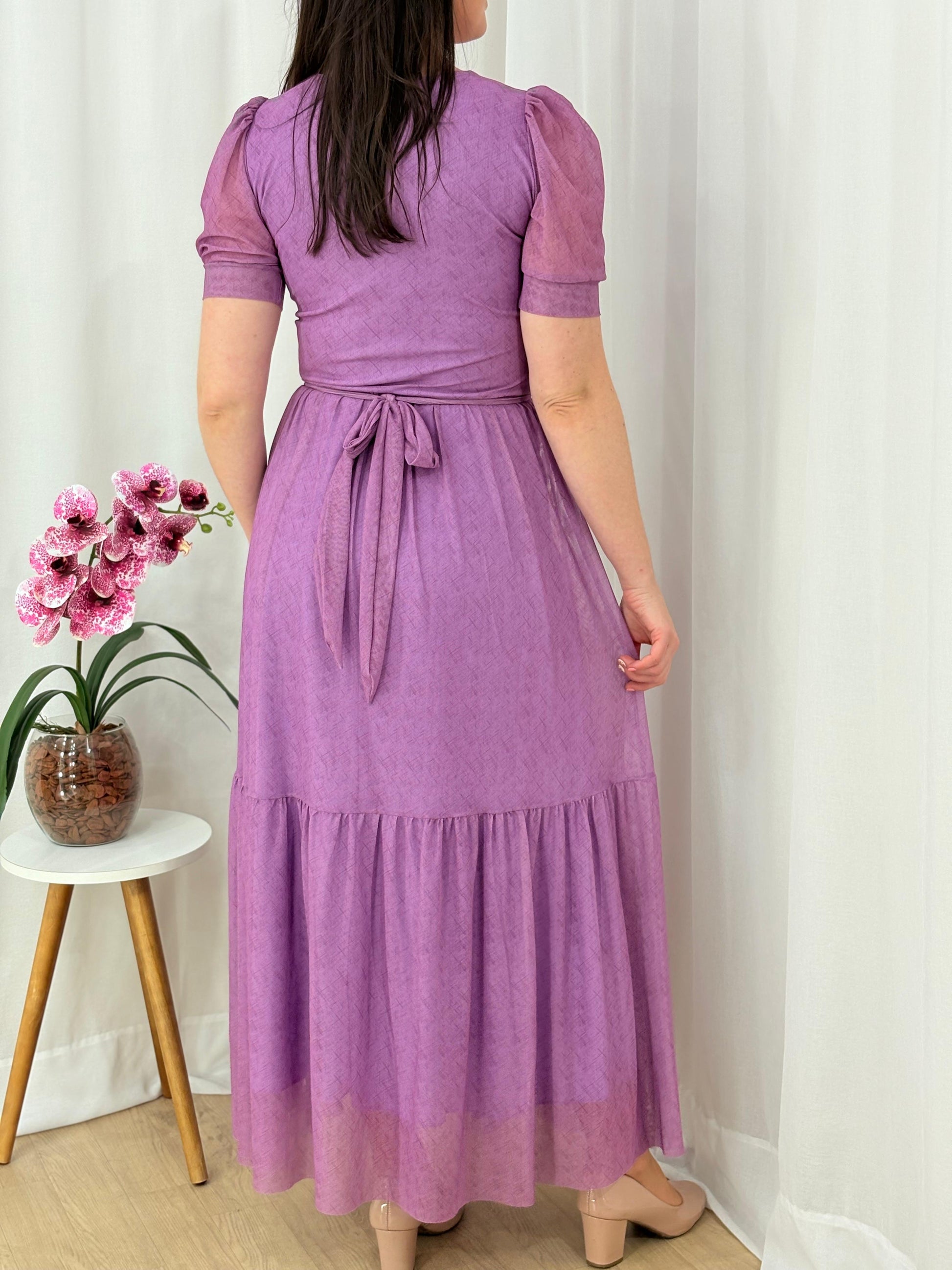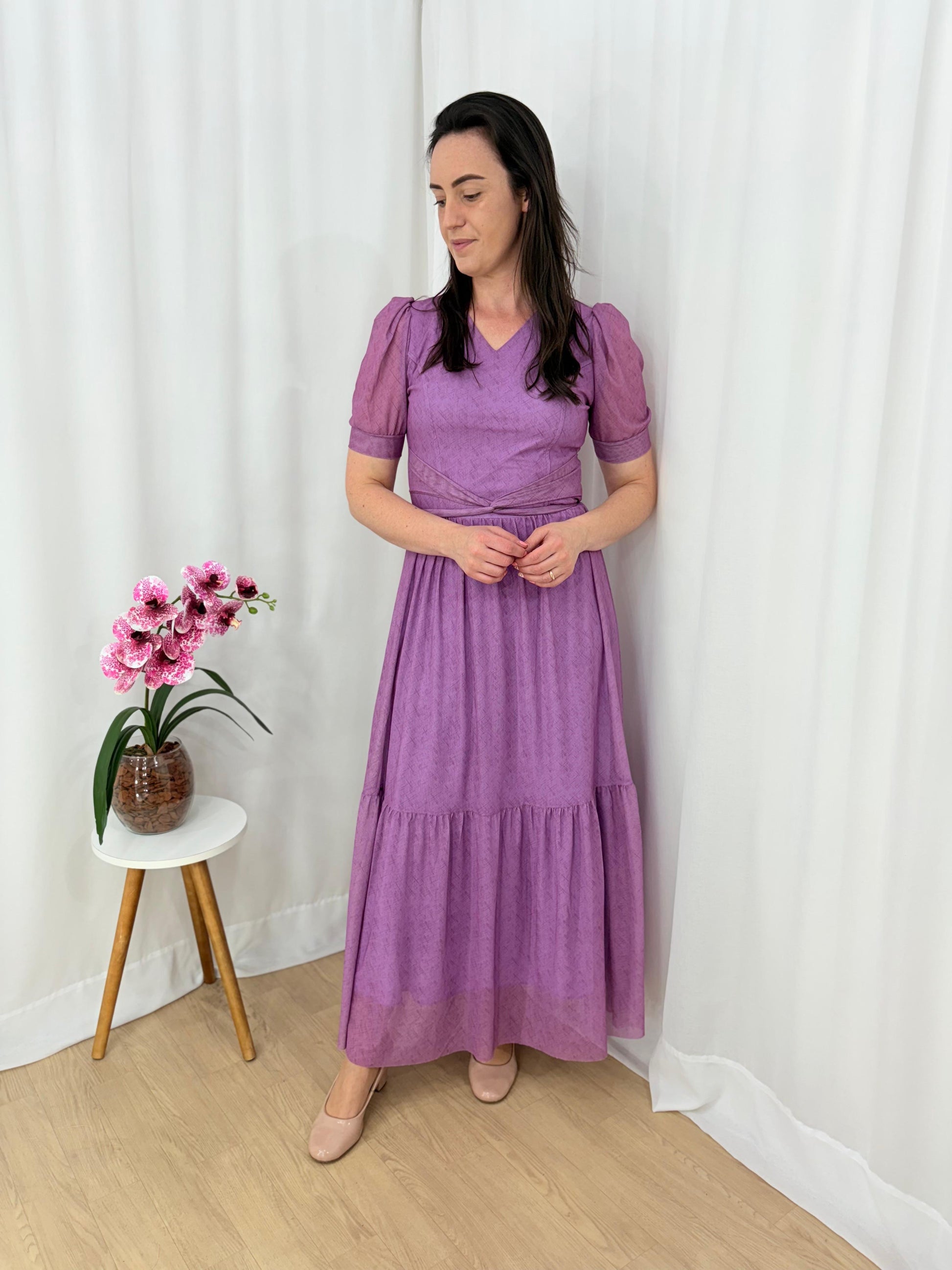 Vestido longo em tule leve e delicado, com forro confortável, modelagem acinturada e mangas levemente bufantes. Possui decote em V e saia fluida com recorte em camadas, trazendo movimento e feminilidade ao look.