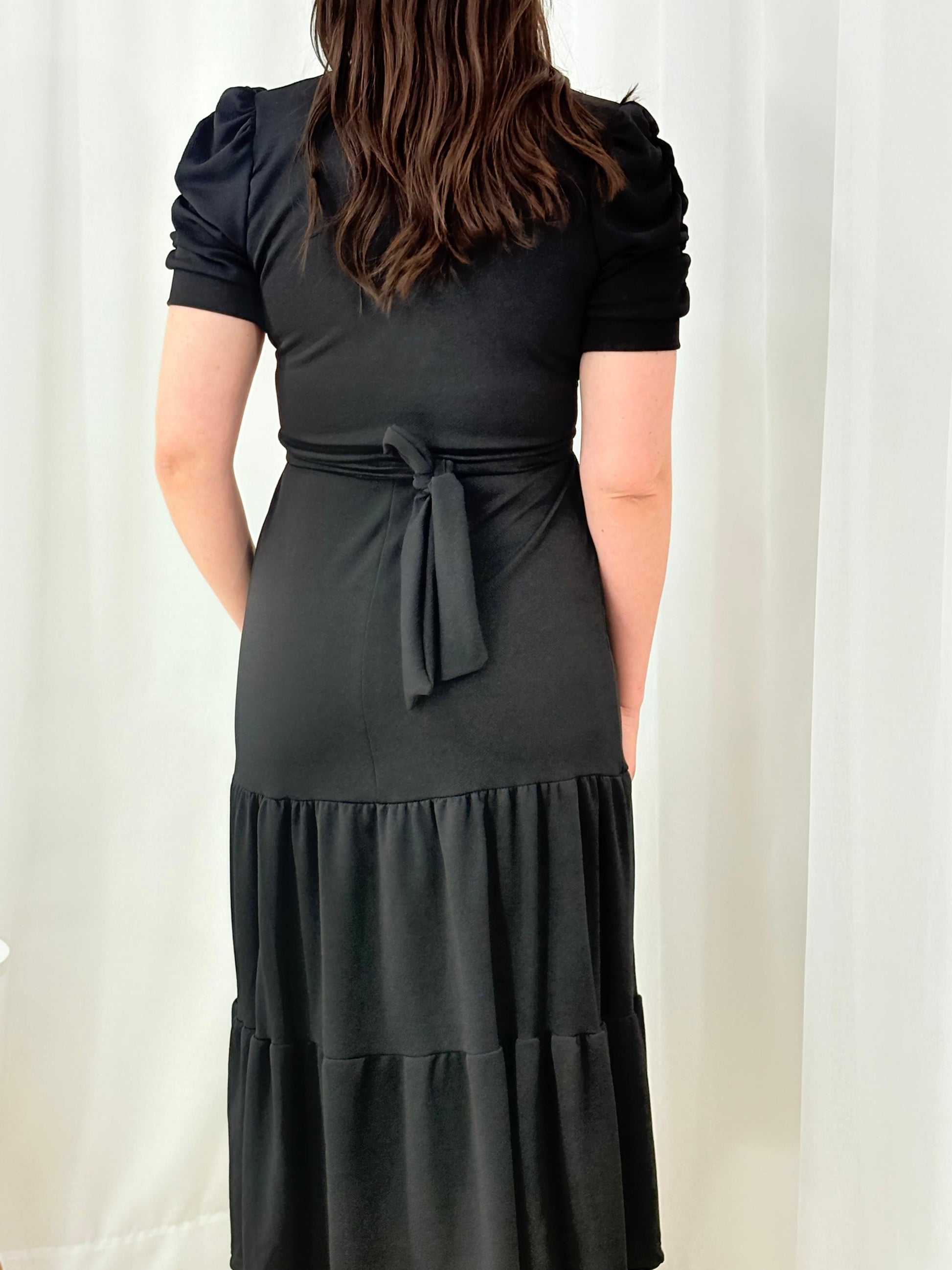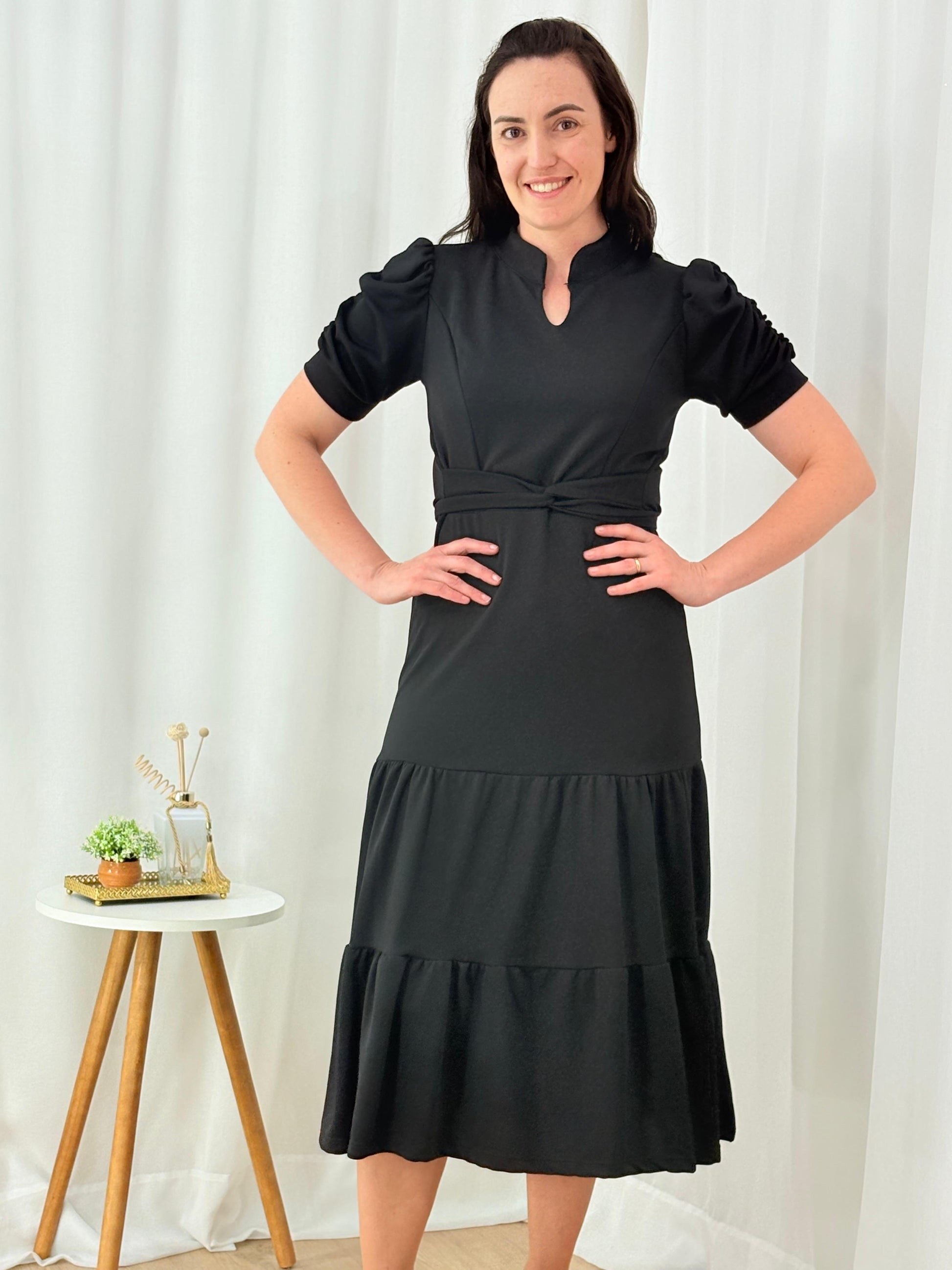 Vestido midi preto em crepe, com manga levemente bufante e recorte delicado no decote. Tamanho único, veste até o 42 com caimento impecável.